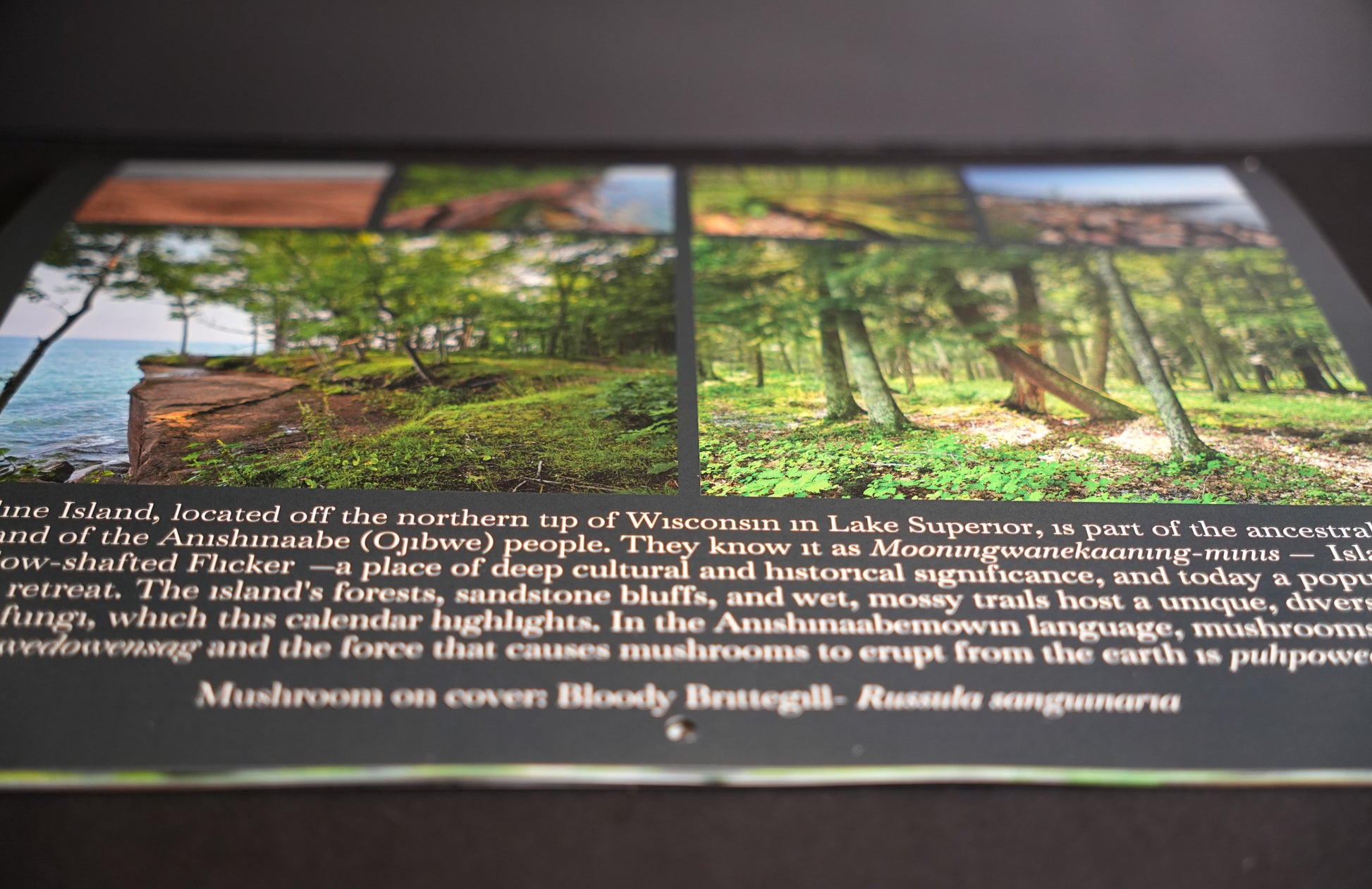 In Anishinaabemowin, mushrooms are called wazhashkwedowensag, and the mysterious force that brings them forth from the earth is puhpowee. This calendar captures that sense of emergence and wonder through vibrant, detailed photography taken across the island’s trails and forests.
