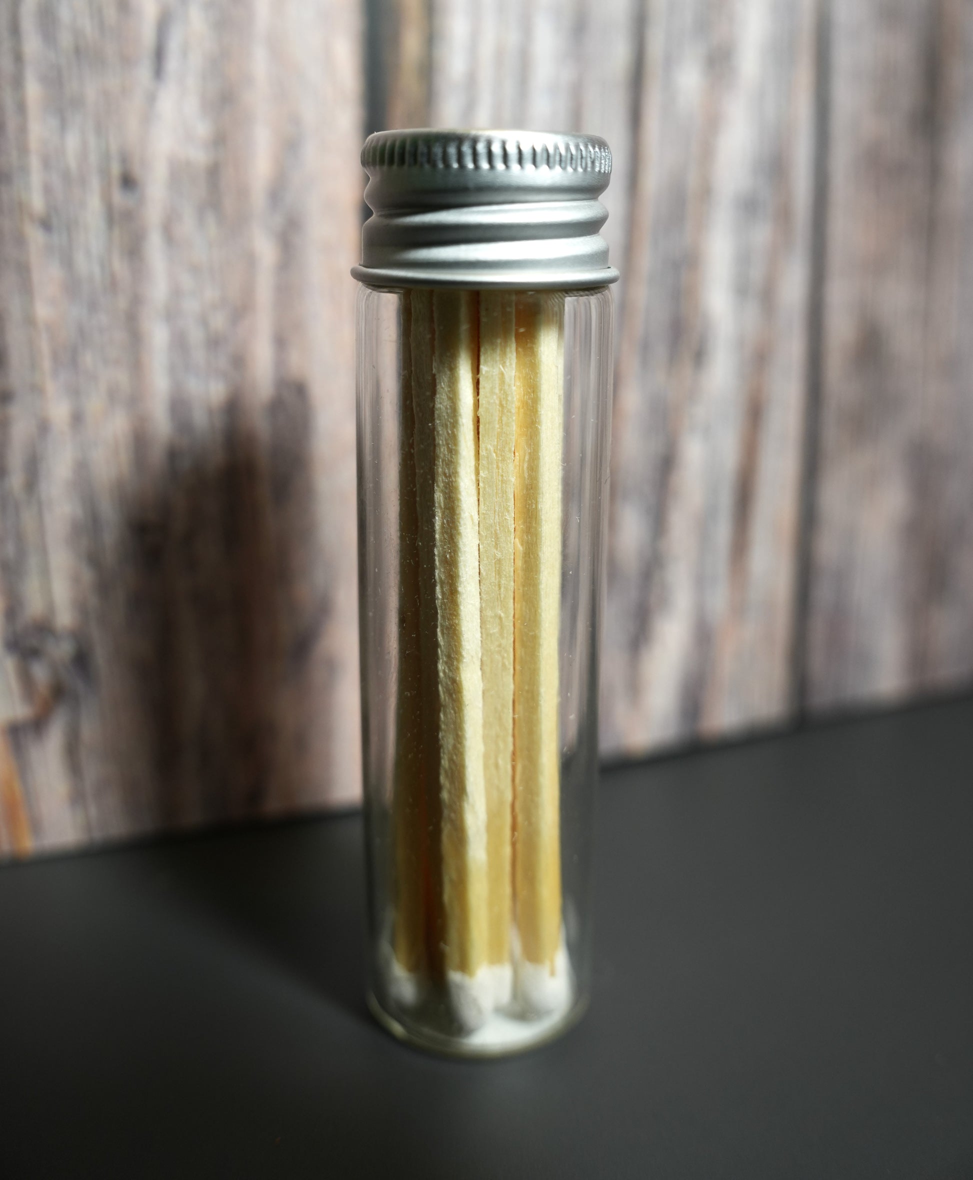 Glass Jar of Matches – 15 wooden matchsticks with a strike pad on the bottom, sealed with a silver metal lid.